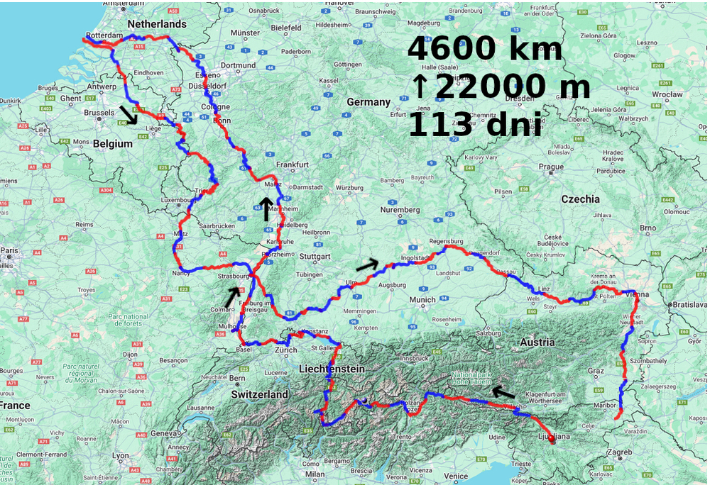 Ko sva doma sredi junija 2024 zajahala kolesi, še nisva imela izdelanega načrta poti. Želela sva se zapeljati do izvira Rena ter nato kolesariti ob njem. In ko sva se po 113 dneh vrnila domov je bilo za nama kar 4600 prekolesarjenih kilometrov in skoraj 22 tisoč višinskih metrov vzpona. Kolesarila sva večinoma ob evropskih rekah ter prečkala pogorja med njimi.